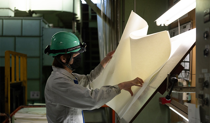 製造途中でストップすることができない抄紙工程なだけに、その手前の段取りと品質チェックへの念の入用は計り知れない。今でこそ安定した品質を誇る『DP PAPER』も実は追加抄造のたびにぎりぎりの品質チェックは欠かせないのだ。