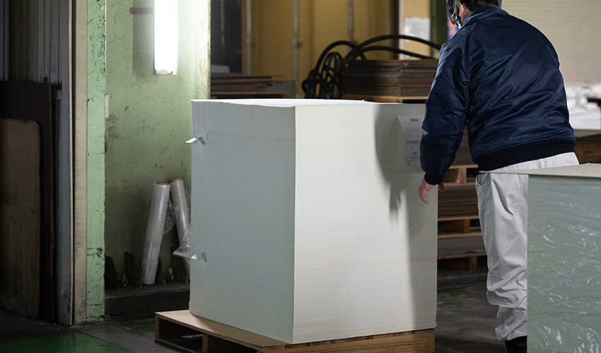 あのパルプがこの一枚の大きな紙に変わった様は誇らしい。積み上げられた紙の束の厚さだけ、これまでの工程と携わった職人たちに想いを馳せる。そして、光に反射した、ほんのりクリームがかった紙の淡い色合いは目に優しく、筆欲を掻き立てる。