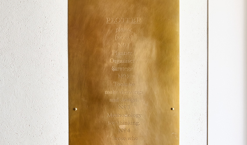 PLOTTERのアイコンパーツでもあるレザーバインダーの真鍮製バックプレートとまさに同じ素材に、PLOTTERのプロダクトコンセプトを刻み込んだ。ぜひ、見るだけではなく手で触れてほしいインスタレーション。